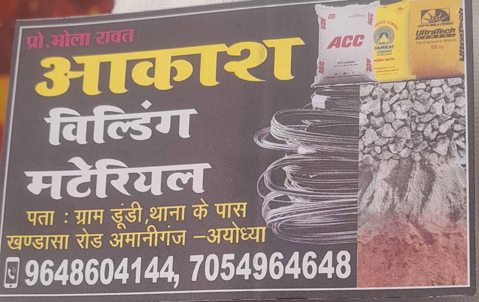 अमानीगंज -अयोध्या आकाश बिल्डिंग मटेरियल की आज हुई ओपनिंग विकासखंड अमानीगंज की ग्राम पंचायत डूडी निवासी भोला रावत है इसके प्रोपराइटर। निकट थाना खंडासा के चंद्र कदम दूरी पर है आकाश बिल्डिंग मटेरियल की दुकान। ग्राहकों को जन सुविधा क्वालिटी और क्वान्टीटी एवं उचित रेट पर मोरंग ,बालू, गिट्टी, सरिया, सीमेंट, इत्यादि उपलब्ध है ग्राहकों से अपील सेवा का अवसर दें मोबाइल नंबर 9648 6041 44