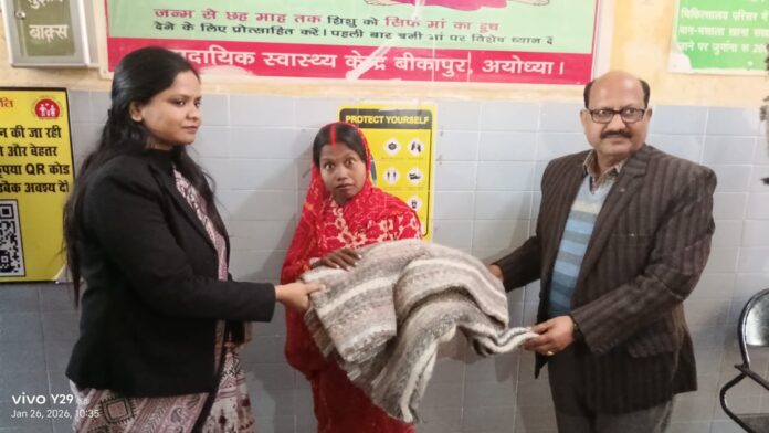 अयोध्या जिले के बीकापुर तहसील में तैनात उपजिलाधिकारी सुश्री श्रेया ने आज ७७ गणतंत्र दिवस पर ध्वजारोहण किया l उसी के कड़ी में तहसील सभागार में अपने अधीन तहसील कर्मियों व तहसील बार के पदाधिकारियों एवं अधिवक्ताओं के साथ गोष्ठी आयोजित करके महापुरुषों के त्याग एवं कुर्बानियों को याद दिलाते हुए, उपजिलाधिकारी सुश्री श्रेया ने बीकापुर सामुदायिक स्वास्थ्य केंद्र पर जाकर भर्ती मरीजों का हाल चाल जाना, तथा जिलाधिकारी द्वारा जारी निर्देशानुसार उपजिलाधिकारी सुश्री श्रेया ने नायब तहसीलदार रामखेलावन की मौजूदगी में अस्पताल में भर्ती प्रसूताओं को फल,बिटकिट्स प्रदान करके एवं ठंडक से बचाव हेतु कंबल का वितरण किया गया,और बेहतर स्वास्थ्य की कामना की , तथा सामुदायिक स्वास्थ्य केंद्र बीकापुर में मिली खामियों के बारे में सुधार के निर्देश देते हुए अस्पताल का दोबारा औचक निरीक्षण करने की बात कही, फल वितरण के समय स्वास्थ्य केंद्र से डाक्टर अनुराग गुप्ता,ड्यूटी पर तैनात स्टाफ नर्स के साथ सफाई कर्मी और तहसील कर्मी,कानूनगो अवधेश कुमार मिश्रा,हल्का लेखपाल भीम सिंह के अलावा अन्य राजस्व कर्मी मौजूद रहे,फल व कम्बल वितरण पर उपजिलाधिकारी सुश्री श्रेया द्वारा मीडिया को दी गई जानकारी।
