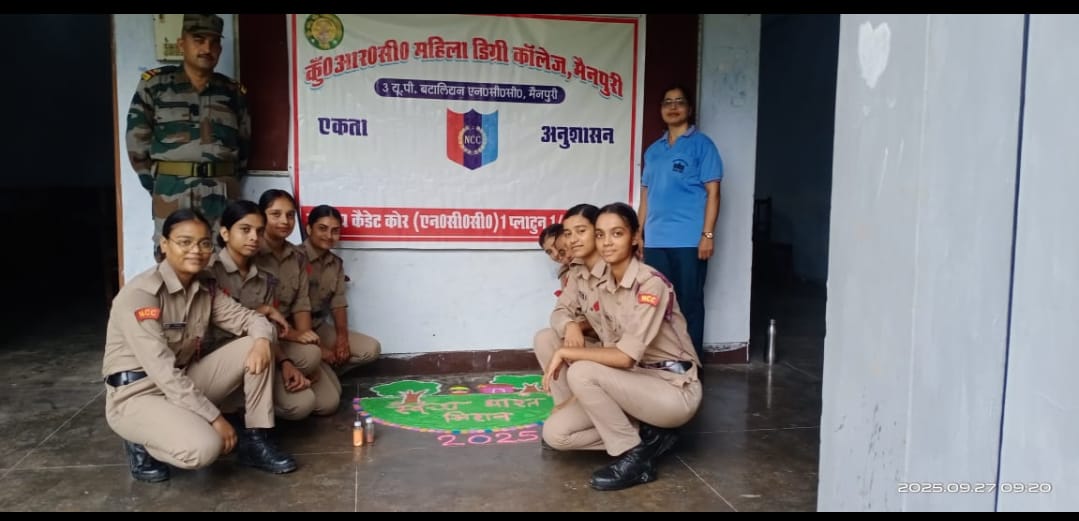 मैनपुरी। कुंवर आरसी महिला महाविद्यालय में आज एनसीसी कैडेट्स द्वारा स्वच्छता अभियान कार्यक्रम, 3 यूपी बटालियन एनसीसी, मैनपुरी के सीओ कर्नल नीरज सिंह के दिशा निर्देशन चलाया गया। इस कार्यक्रम में रंगोली, कविता, भाषण और प्रतिज्ञा का आयोजन किया गया। कार्यक्रम में महाविद्यालय के सभी कैडिटस ने बढ़ चढ़कर हिस्सा लिया। इस अवसर पर रंगोली में पायल, हेमा, निशा, रियाना निगम, तनु, सोनम, प्रगति यादव ने उत्कृष्ठ कार्य किया। कविता पाठ मे प्रियांशी यादव, भाषण में रितु सिंह और प्रगति यादव ने बेहतरीन प्रदर्शन किया। इस अवसर पर कॉलेज की प्राचार्य डॉक्टर शेफाली यादव ने सभी कैडेट्स का उत्साहवर्धन करते हुए स्वच्छता के बारे में बताया और एनसीसी की (एएनओ) लेफ्टिनेंट सविता ने सभी कैडेट्स को स्वच्छता अभियान के तहत प्रतिज्ञाएं दिलवाई , उनके साथ कार्यक्रम में संजना श्रीवास्तव, नायब सूबेदार मुकेश कुमार और हवलदार राहुल तोमर उपस्थित रहे।