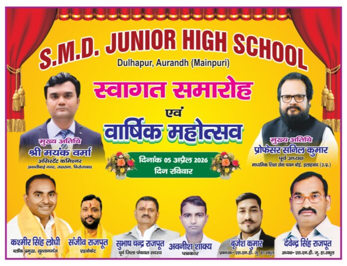 बिछवा/मैनपुरी: क्षेत्र के दूल्हापुर, औरंध स्थित एस.एम.डी. जूनियर हाई स्कूल में आगामी 05 अप्रैल 2026, रविवार को वार्षिक महोत्सव एवं स्वागत समारोह का भव्य आयोजन किया जा रहा है। विद्यालय प्रांगण में आयोजित होने वाले इस कार्यक्रम में शिक्षा और प्रशासन जगत की कई बड़ी हस्तियां शिरकत करेंगी।कार्यक्रम के मुख्य अतिथि के रूप में अवन्तीबाई नगर (जसराना, फिरोजाबाद) के असिस्टेंट कमिश्नर श्री मयंक वर्मा उपस्थित रहेंगे। उनके साथ ही विशिष्ट अतिथि के रूप में उत्तर प्रदेश माध्यमिक शिक्षा सेवा चयन बोर्ड (इलाहाबाद) के पूर्व अध्यक्ष प्रोफेसर सनिल कुमार शिरकत करेंगे।विद्यालय प्रबंधन के अनुसार, समारोह की तैयारियाँ जोरों पर हैं। इस अवसर पर छात्र-छात्राओं द्वारा विभिन्न सांस्कृतिक प्रस्तुतियाँ दी जाएंगी और मेधावी छात्र-छात्राओं को सम्मानित भी किया जाएगा। विद्यालय के प्रधानाचार्य एवं प्रबंधक ने क्षेत्र के प्रबुद्ध जनों और अभिभावकों से कार्यक्रम में उपस्थित होकर छात्र-छात्राओं का उत्साहवर्धन करने की अपील की है।