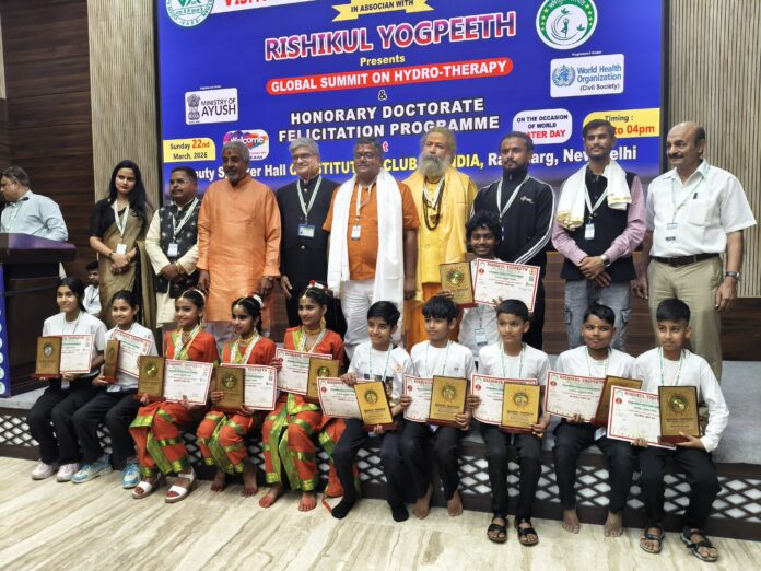 थानाभवन/शामली ऋषिकुल योगपीठ एवं विश्व आरोग्य संवर्धन संस्थान द्वारा 22 मार्च 2026 को कॉन्स्टिट्यूशन क्लब ऑफ इंडिया के डिप्टी स्पीकर हॉल, रफी मार्ग, नई दिल्ली में ग्लोबल समिट ऑन हाइड्रो-थेरेपी एंड अवार्ड फंक्शन का आयोजन किया गया। कार्यक्रम में जल चिकित्सा के वैज्ञानिक, चिकित्सीय एवं व्यावहारिक पहलुओं पर विशेषज्ञों द्वारा विस्तृत चर्चा एवं कार्यशालाएं आयोजित की गईं।इस अंतरराष्ट्रीय स्तर के सम्मेलन में उन्नति योग सेंटर, जलालाबाद के 8 विद्यार्थियों ने सामूहिक योगासन प्रस्तुति देकर सभी को प्रभावित किया।उत्कृष्ट प्रदर्शन के लिए सभी 8 विद्यार्थियों को प्रमाण पत्र, ट्रॉफी एवं बेस्ट परफॉर्मर अवार्ड से सम्मानित किया गया।कार्यक्रम की विशेष उपलब्धि यह रही कि सामूहिक प्रस्तुति देने वाले सभी 8 विद्यार्थियों का चयन आगामी राष्ट्रीय प्रतियोगिता के लिए किया गया है, जो कि अयोध्या, उत्तर प्रदेश में आयोजित होगी।संस्थान के प्रशिक्षक योगाचार्य विशाल शर्मा ने बताया कि यह सफलता विद्यार्थियों की कड़ी मेहनत, अनुशासन एवं समर्पण का परिणाम है। उन्होंने विश्वास जताया कि विद्यार्थी भविष्य में भी इसी प्रकार उत्कृष्ट प्रदर्शन कर संस्थान एवं क्षेत्र का नाम रोशन करेंगे।चयनित विद्यार्थियों में जीविका सैनी पुत्री रवींद्र सैनी, अनन्या शर्मा पुत्री विपिन (बिट्टू) शर्मा, अभिनंदन सैनी पुत्र नितिन सैनी, आरव राणा पुत्र पुष्पेंद्र कुमार, अवनीश पुत्र कँवरपाल सिंह, हार्दिक रॉय पुत्र सोनू कुमार, अर्पित कश्यप पुत्र मोनू कश्यप एवं रुद्र सैनी पुत्र रविंद्र सैनी शामिल हैं।संस्थान की ओर से सभी विद्यार्थियों एवं अभिभावकों को इस उपलब्धि पर बधाई दी गई।