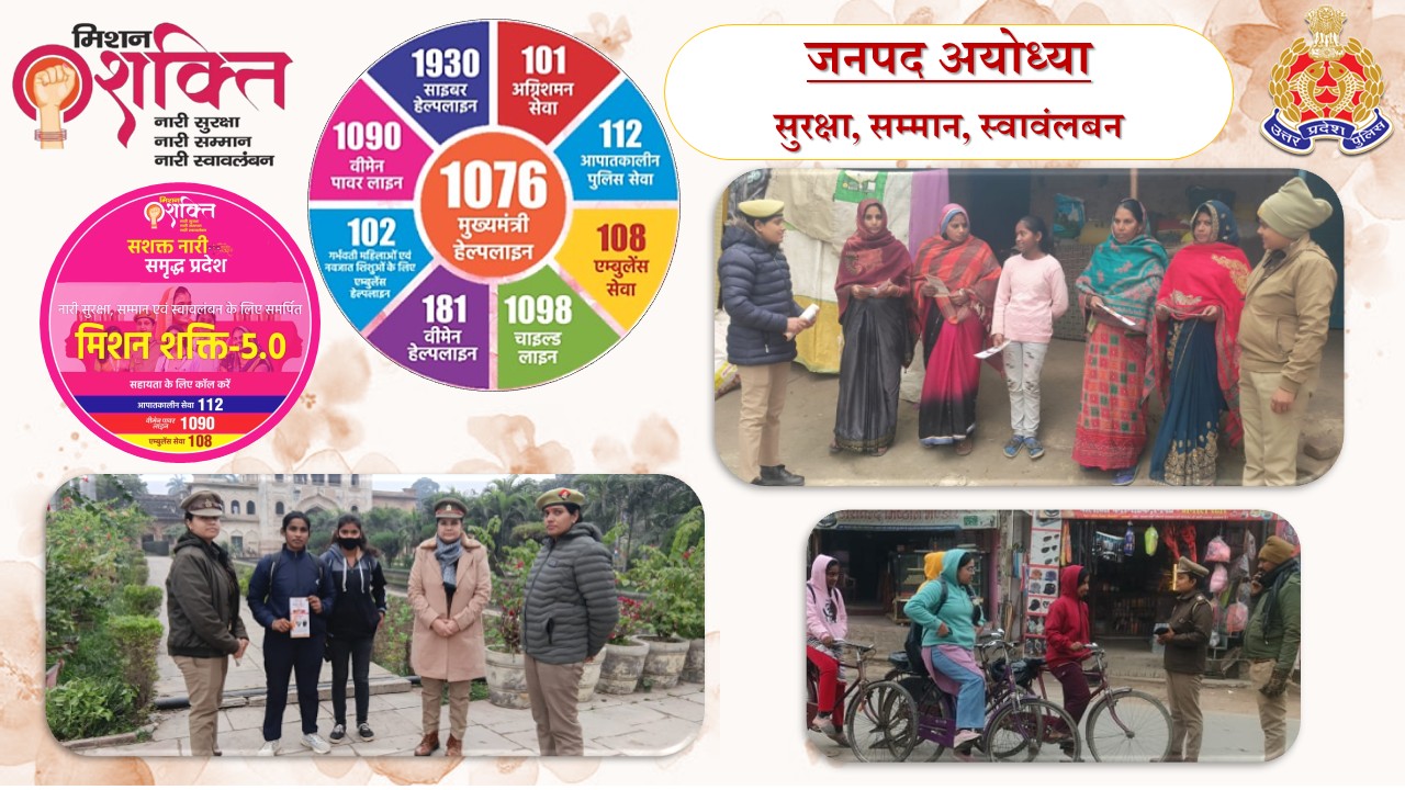 अयोध्या मिशन शक्ति _05 के अन्तर्गत सार्वजनिक स्थानों/स्कूलों/बाजार/चौक/गांवों इत्यादि जगहों पर अभियान चलाकर महिलाओं/बालिकाओं/छात्राओं को किया जा रहा है जागरूक व संदिग्धों को दी गयी हिदायत। नारी सुरक्षा/नारी सम्मान/नारी स्वावलंबन UPPolice की सेवाओं व शासन द्वारा चलाये जा रहें विभिन्न योजनाओं के बारे में जागरूक किया जा रहा है: जागरुक बनें, सुरक्षित रहें।*1090 – महिला पावर लाइन (महिलाओं के लिए हेल्पलाइन)181 – महिला हेल्पलाइन (महिलाओं के लिए आपातकालीन सहायता)112 – आपातकालीन सेवा (पुलिस, फायर ब्रिगेड और एम्बुलेंस के लिए)1076 – सीएम हेल्पलाइन (मुख्यमंत्री कार्यालय के लिए शिकायतें और सुझाव)1930 – साइबर सुरक्षा हेल्पलाइन (साइबर अपराधों के लिए सहायता)*छात्राओं को दी गई उपयोगी जानकारी**1. महत्वपूर्ण हेल्पलाइन नंबर*o वूमेन पावर लाइन : 1090o पुलिस आपातकालीन सेवा : 112o महिला हेल्पलाइन : 181o मुख्यमंत्री हेल्पलाइन : 1076o चाइल्ड लाइन : 1098o एम्बुलेंस सेवा : 108o स्वास्थ्य सेवा : 102o साइबर क्राइम हेल्पलाइन : 1930*2. प्रासंगिक विषयों पर मार्गदर्शन*o गुड टच – बैड टच की जानकारी।o घरेलू हिंसा व उससे संबंधित कानूनी प्रावधान।o साइबर अपराधों के खतरों और उनसे बचाव के उपाय।o शासन द्वारा संचालित विभिन्न कल्याणकारी योजनाओं के लाभ।*3. मिशन शक्ति केंद्रों की भूमिका*o सभी को अवगत कराया गया कि जनपद के प्रत्येक थाने पर नवस्थापित मिशन शक्ति केंद्र कार्यरत हैं।o इन केंद्रों पर महिलाओं को त्वरित सहायता, परामर्श, शिकायत निस्तारण एवं योजनाओं की जानकारी उपलब्ध कराई जाएगी।