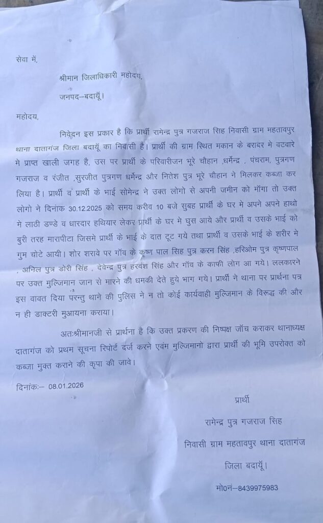 बदायूं दातागंज , पुलिस पर कार्रवाई न करने का आरोप कोतवाली क्षेत्र अंतर्गत ग्राम मेहतपुर में जमीन के विवाद को लेकर एक युवक के साथ मारपीट का मामला सामने आया है। पीड़ित रविंद्र ने आरोप लगाया है कि उसके भाई और भतीजों ने मिलकर उसकी बेरहमी से पिटाई की। मारपीट की घटना का वीडियो सोशल मीडिया पर तेजी से वायरल हो रहा है।पीड़ित रविंद्र के अनुसार, उनकी जमीन का बंटवारा पहले ही हो चुका था, लेकिन जमीन का एक छोटा हिस्सा ऐसा था जो अब तक साझा (शामिल) था। उस हिस्से को सभी परिजन पशुओं को बांधने के लिए उपयोग करते थे और आपसी सहमति से उसे पशुओं के लिए ही छोड़ा गया था। अब उसी जमीन के हिस्से को लेकर विवाद शुरू हो गया है।रविंद्र ने बताया कि उसके भाई और भतीजे दबंग प्रवृत्ति के हैं और इससे पहले भी कई बार उसके साथ मारपीट कर चुके हैं। ताजा घटना में भी सभी ने मिलकर उसकी पिटाई की, जिसका वीडियो किसी ने बना लिया और वह अब सोशल मीडिया पर वायरल हो रहा है।पीड़ित ने इस संबंध में कोतवाली दातागंज में प्रार्थना पत्र देकर शिकायत दर्ज कराई है, लेकिन आरोप है कि पुलिस ने अभी तक कोई ठोस कार्रवाई नहीं की है। कार्रवाई न होने से पीड़ित और उसके परिवार में भय और आक्रोश का माहौल है।