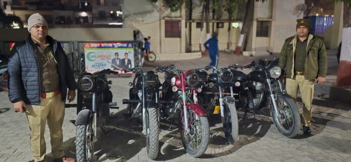 मेरठ पुलिस द्वारा पटाखे की आवाज करने वाली बिना नम्बर प्लेट की पाँच बुलेट मोटरसाइकिलों की गयी सीज। वरिष्ठ पुलिस अधीक्षक मेरठ के आदेशानुसार जनपद में निरन्तर चलाये जा रहे “ऑपरेशन नकेल” अभियान के क्रम में पुलिस अधीक्षक नगर तथा क्षेत्राधिकारी दौराला के कुशल निर्देशन में थाना दौराला पुलिस टीम द्वारा थाना क्षेत्र में लगातार की जा रही सघन चेकिंग के दौरान बिना नम्बर प्लेट की तथा पटाखे जैसी आवाज उत्पन्न करने वाली पाँच बुलेट मोटरसाइकिलों को सीज कर आवश्यक वैधानिक कार्यवाही की जा रही है।*बुलेट मोटरसाइकिलें पकड़ने वाली पुलिस टीम का विवरणः-*1. उ0नि0 विनित कुमार, थाना कंकरखेडा मेरठ2. हे0का0 1374 हरमेन्द्र पंवार, थाना कंकरखेडा मेरठ3. का0 1593 अवनीश, थाना कंकरखेडा मेरठ