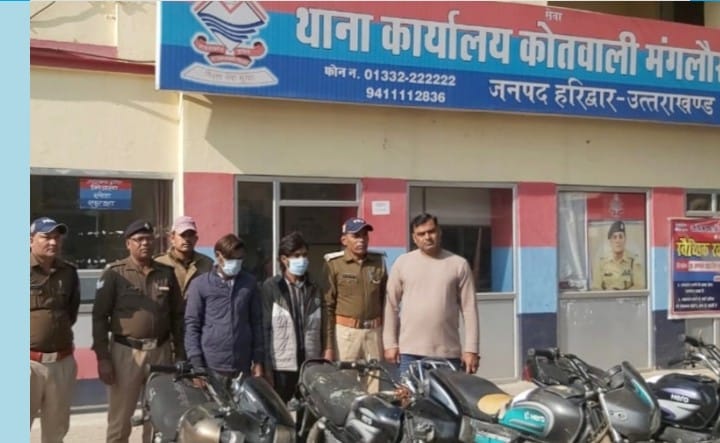 हरिद्वार मंगलौर कोतवाली पुलिस ने चोरी की चार मोटरसाइकिलों के साथ दो चोरों को गिरफ्तार करने में सफलता हासिल की है पकड़े गए चोरों का आपराधिक इतिहास पुलिस से मिली जानकारी के अनुसार क्षेत्र में पिछले काफी दिनों से मंगलौर कोतवाली पुलिस को वाहन चोरी की शिकायत मिल रही थी क्षेत्र में बढ़ती दो पहिए वाहन चोरी की घटनाओं का संज्ञान लेते हुए एसएसपी हरिद्वार परमेंद्र सिंह डोभाल मंगलौर कोतवाली पुलिस को जल्द वाहन चोरी परअंकुश लगाने के निर्देश जारी किया पुलिस अधीक्षक ग्रामीण के कुशल निर्देशन तथा अपर पुलिस अधीक्षक मंगलौर के कुशल प्रशिक्षण में प्रभारी निरीक्षक कोतवाली मंगलौर द्वारा टीमों का गठन किया गया तथा कुशल सुराग शेयर करते हुए चोरों की घटनाओं के आसपास लगे सीसीटीवी कैमरा का कंगाल ते हुए मोटरसाइकिल मैकेनिक आदि का सत्यापन की कार्रवाई की गई पुलिस के के किस अभियान के कारण उन्हें सफलता मिली और पुलिस ने दो चोरों को चोरी की चार मोटरसाइकिल के साथ गिरफ्तार किया पूछताछ में पकड़े गए दोनों चोरों ने पूछताछ को बताया कि उन्होंने जनपद हरिद्वार के अलग-अलग स्थान से यह मोटरसाइकिल चोरी की है दोनों आरोपियों के नाम गुलजार पुत्र स्व मनोवर निवासी ग्राम बनेड़ा टांडा कोतवाली मंगलौर सोनू पुत्र स्व निवासी ग्राम बनेडा टांडा कोतवाली मंगलौर बताया है,,,,,, मोनी सैनी की खास रिपोर्ट