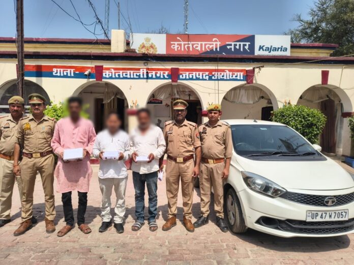 अयोध्या लोगो को झांसा देकर गाड़ी में बैठाकर उनसे पैसा चोरी करने व बीच रास्ते में छोड़कर भाग जाने से सम्बन्धित संगठित अपराध कारित करने वाले गिरोह के 03 शातिर अभियुक्त गिरफ्तार, 01 कार, 01 देशी तमंचा व रूपये बरामद। वरिष्ठ पुलिस अधीक्षक अयोध्या, डा0 गौरव ग्रोवर द्वारा अपराध नियंत्रण एवं अपराधियों के विरूद्ध चलाये जा रहे अभियान के अन्तर्गत एवं पुलिस अधीक्षक नगर चक्रपाणि त्रिपाठी के निर्देशन व क्षेत्राधिकारी नगर श्रीयश त्रिपाठी के कुशल पर्यवेक्षण में प्रभारी निरीक्षक कोतवाली नगर श्री अश्विनी कुमार पाण्डेय के नेतृत्व में गठित टीम द्वारा दिनांक 16.03.2026 को उ0नि0 जयकिशोर अवस्थी मय हमराह के मु0अ0सं0 122/26 अन्तर्गत धारा 303(2)/111(6)/317(2) BNS में मुखबिर खास की सूचना पर उसरू नहर की पुलिया रायबरेली रोड के पास से 03 अभियुक्तों को गिरफ्तार किया गया। अभियुक्तों ने पूछताछ करने पर बताया कि साहब हम लोग हाइवे पर लोगो को बहला कर गाड़ी में बैठा लेते थे व उसके बाद उससे बाते करते करते पैसा व अन्य कीमती सामग्री ले लेते थे तथा गाड़ी के पीछे लगे नम्बर प्लेट के बारे में पूछताछ करने पर बताया कि गाड़ी के पीछे से गाड़ी के नम्बर प्लेट का फोटो न ले ले इसके लिये हम लोगो ने उसे हटा कर रखा है । अभियुक्तगण को गिरफ्तार कर वैधानिक कार्यवाही की जा रही है । गिरफ्तार अभियुक्तगण का नाम पताः-1. अनिल सिंह पुत्र स्वर्गीय दया शंकर सिंह निवासी ग्राम मढ़ना थाना महाराजगंज जनपद अयोध्या उम्र करीब 34 वर्ष2. आनंद पांडेय पुत्र स्वर्गीय राज नारायण पांडेय निवासी ग्राम सालिक पंडित का पुरवा सनेथू थाना पूराकलंदर जनपद अयोध्या उम्र 40 वर्ष3. भास्कर पांडेय उर्फ पप्पू पुत्र राम प्रसाद पांडेय निवासी ग्राम सालिक पंडित का पुरवा सनेथू थाना पूराकलंदर जनपद अयोध्या उम्र 48 वर्ष*गिरफ्तार अभियुक्तगण से बरामदगी का विवरण-*1. 25300 रुपए एक अदद घटना में प्रयुक्त हुआ टाटा टियागो कार मु0अ0सं0 122/26 अन्तर्गत धारा 303(2)/111(6)/317(2) BNS थाना को0 नगर जनपद अयोध्या2. एक अदद तमंचा देशी नाजायज 315 बोर व 02 अदद जिन्दा कारतूस संबंधित मु0अ0सं0 135/26 धारा 3/25 आर्म्स एक्ट थाना को0 नगर जनपद अयोध्या*अनिल सिंह का आपराधिक इतिहास-*1. मु0अ0सं0 122/26 अन्तर्गत धारा 303(2)/111(6)/317(2) BNS थाना को0 नगर जनपद अयोध्या2. मु0अ0सं0 416/2020 धारा 504/506 भादवि थाना महराजगंज जनपद अयोध्या3. मु0अ0सं0 237/2006 धारा 364 भादवि थाना खण्डासा जनपद अयोध्या*आनंद पांडेय(HS 162A थाना पुराकलन्दर जनपद अयोध्या) का आपराधिक इतिहास-*1. मु0अ0सं0 122/26 अन्तर्गत धारा 303(2)/111(6)/317(2) BNS थाना को0 नगर जनपद अयोध्या2. मु0अ0सं0 135/26 धारा 3/25 आर्म्स एक्ट थाना को0 नगर जनपद अयोध्या3. मु0अ0सं0 0669/2016 धारा 379, 411, 413 भादवि थाना कोतवाली अयोध्या जनपद अयोध्या4. मु0अ0सं0 0175/2023 धारा 379, 411 भादवि थाना कोतवाली अयोध्या जनपद अयोध्या5. मु0अ0सं0 0177/2023 धारा 393 भादवि थ