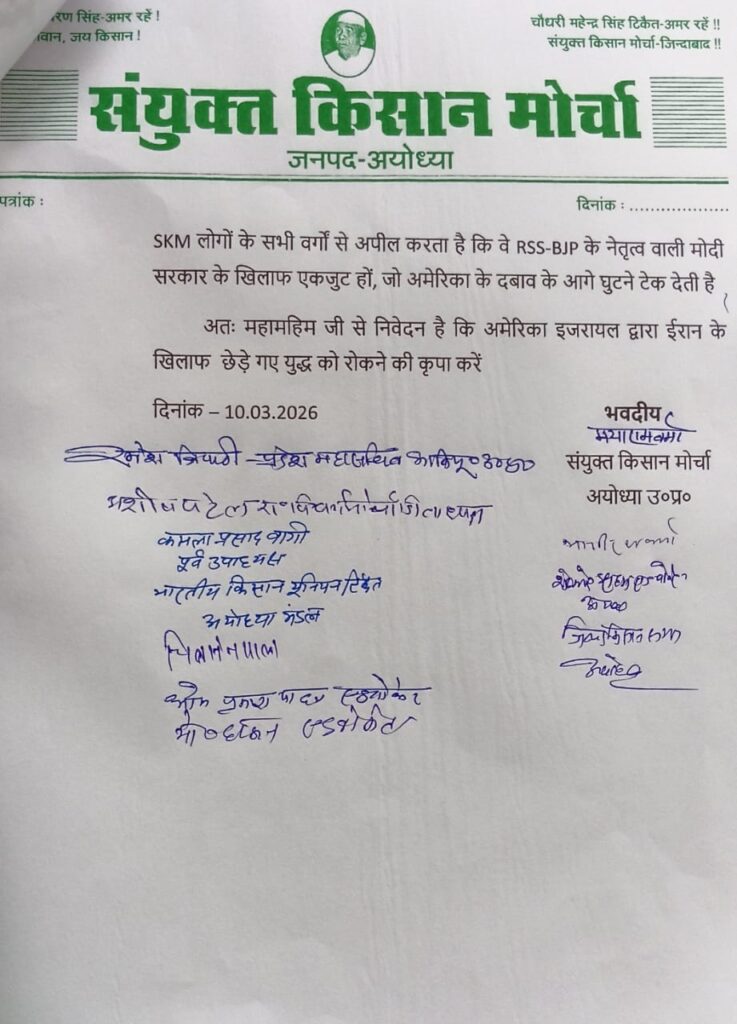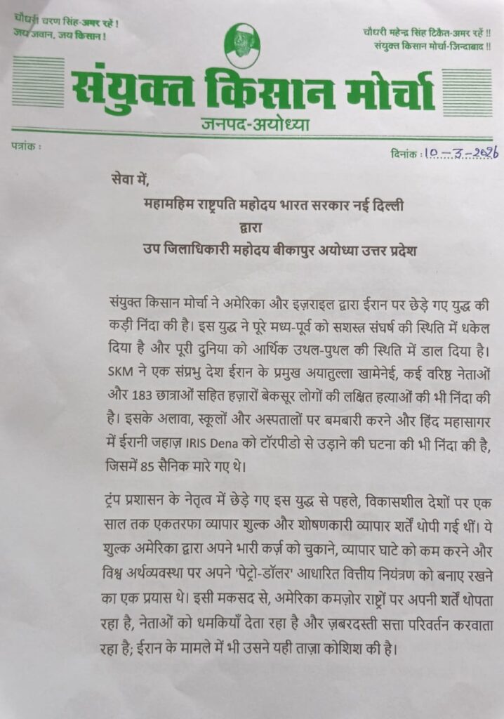 अयोध्या युद्ध विराम लगाने हेतु संयुक्त किसान मोर्चा के नेताओं ने महामहिम राष्ट्रपति महोदय भारत सरकार नई दिल्ली के नाम निंदा करते हुए युद्ध विराम लगाते की यांचना करके उप जिलाधिकारी महोदय बीकापुर अयोध्या उत्तर प्रदेश द्वारा ज्ञापन सौंपा* संयुक्त किसान मोर्चा ने अमेरिका और इज़राइल द्वारा ईरान पर छेड़े गए युद्ध की कड़ी निंदा की है। इस युद्ध ने पूरे मध्य-पूर्व को सशस्त्र संघर्ष की स्थिति में धकेल दिया है और पूरी दुनिया को आर्थिक उथल-पुथल की स्थिति में डाल दिया है। SKM ने एक संप्रभु देश ईरान के प्रमुख अयातुल्ला खामेनेई, कई वरिष्ठ नेताओं और 183 छात्राओं सहित हज़ारों बेकसूर लोगों की लक्षित हत्याओं की भी निंदा की है। इसके अलावा, स्कूलों और अस्पतालों पर बमबारी करने और हिंद महासागर में ईरानी जहाज़ IRIS Dena को टॉरपीडो से उड़ाने की घटना की भी निंदा की है, जिसमें 85 सैनिक मारे गए थे।ट्रंप प्रशासन के नेतृत्व में छेड़े गए इस युद्ध से पहले, विकासशील देशों पर एक साल तक एकतरफा व्यापार शुल्क और शोषणकारी व्यापार शर्तें थोपी गई थीं। ये शुल्क अमेरिका द्वारा अपने भारी कर्ज़ को चुकाने, व्यापार घाटे को कम करने और विश्व अर्थव्यवस्था पर अपने ‘पेट्रो-डॉलर’ आधारित वित्तीय नियंत्रण को बनाए रखने का एक प्रयास थे। इसी मकसद से, अमेरिका कमज़ोर राष्ट्रों पर अपनी शर्तें थोपता रहा है, नेताओं को धमकियाँ देता रहा है और ज़बरदस्ती सत्ता परिवर्तन करवाता रहा है; ईरान के मामले में भी उसने यही ताज़ा कोशिश की है।आज अमेरिका न केवल विश्व शांति और मेहनतकश लोगों का सबसे बड़ा दुश्मन है, बल्कि संयुक्त राष्ट्र जैसे अंतर्राष्ट्रीय संस्थागत तंत्रों के लिए भी सबसे बड़ा खतरा है। खाड़ी क्षेत्र में छिड़ा यह युद्ध विश्व अर्थव्यवस्था और भारत के लोगों के लिए नई मुसीबतें लेकर आएगा। 90 लाख से ज़्यादा भारतीय नागरिक, जिनके 5 करोड़ से ज़्यादा आश्रित हैं, खाड़ी देशों में भारत की तुलना में बेहतर वेतन वाली नौकरियों में काम करते हैं। उनकी सुरक्षा खतरे में है। खाड़ी देश भारत के लिए महत्वपूर्ण हैं क्योंकि हमारे कच्चे तेल का 55% आयात उन्हीं के क्षेत्र से होता है। खाड़ी देश भारत से 60 लाख टन से ज़्यादा बासमती चावल के साथ-साथ भैंस के मांस, समुद्री उत्पादों, चीनी और ताज़ी सब्जियों और फलों की बड़ी खेप भी आयात करते हैं। ये निर्यात भारत में लाखों किसानों, श्रमिकों और MSMEs को आजीविका प्रदान करते हैं।SKM ने प्रधानमंत्री मोदी की इज़राइल यात्रा की आलोचना की, जो ईरान पर हमले से ठीक दो दिन पहले हुई थी; उन्होंने 75,000 फिलिस्तीनियों के नरसंहार को नज़रअंदाज़ किया, और ईरान के नेतृत्व के प्रमुख की हत्या की तुरंत और स्पष्ट रूप से निंदा करने में उनकी विफलता ने RSS-BJP सरकार के फास