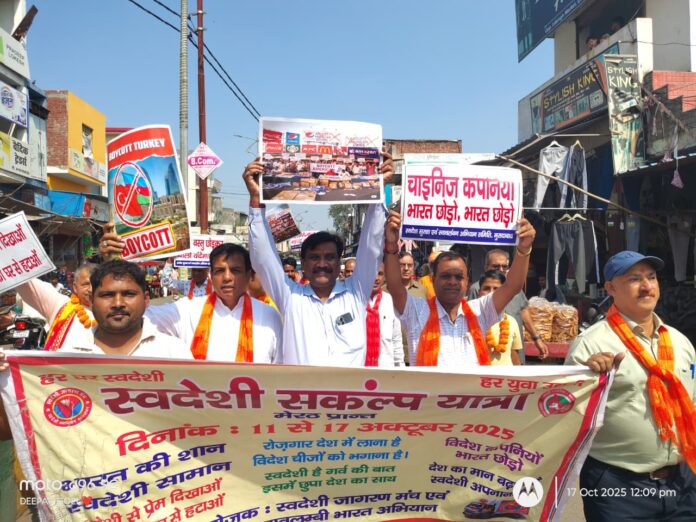 शामली व्यापारी सुरक्षा फोरम संस्थान, जनपद द्वारा कार्यकारी प्रदेश अध्यक्ष श्री विजय गर्ग (पूर्व आई.जी.) की अध्यक्षता में स्वदेशी जागरण मंच की जन जागरण यात्रा का शामली पहुंचने पर भव्य स्वागत किया गया।इस अवसर पर संस्था के सभी पदाधिकारियों एवं सदस्यों ने स्वदेशी जागरण मंच की टीम के साथ नगर के मुख्य बाज़ारों में पदयात्रा कर “स्वदेशी अपनाओ – विदेशी हटाओ” के नारों से वातावरण को स्वदेशीमय बना दिया। यात्रा मार्ग में अनेकों स्थानों पर व्यापारी भाइयों द्वारा फूल वर्षा कर यात्रा का स्वागत व अभिनंदन किया गया।यात्रा का नेतृत्व स्वदेशी जागरण मंच के प्रांत संयोजक श्री कपिल नारंग, पूर्णकालिक श्री विजेन्द्र कुमार एवं मोंटी जी ने किया।कार्यक्रम का आयोजन व्यापारी सुरक्षा फॉर्म जनपद शामली के जिला अध्यक्ष श्री अमित गर्ग, जिला महामंत्री श्री अमित मित्तल एवं श्री वैभव प्रकाश गोयल के कुशल नेतृत्व में किया गया, जबकि कार्यक्रम का संचालन एवं मार्गदर्शन प्रदेश महामंत्री श्री प्रदीप विश्वकर्मा द्वारा भव्य रूप में संपन्न कराया गया।इस अवसर पर नगर पालिका परिषद शामली के अध्यक्ष श्री अरविंद संगल,वरिष्ठ नागरिक सेवा समिति के राष्ट्रीय अध्यक्ष श्री सत्य प्रकाश अग्रवाल,शामली अध्यक्ष श्री अशोक वशिष्ठ,क्रीड़ा भारती के जिला अध्यक्ष श्री राजेन्द्र स्वामी,राष्ट्रीय लोक दल व्यापार प्रकोष्ठ के जिला अध्यक्ष श्री विकास धीमान, श्री सुभाष चंद्र शर्मा, श्री मुकेश वर्मा, श्री विनोद शर्मा, श्री अजय कुमार शर्मा,धीमान मिलन मंडल के महामंत्री श्री संजय धीमान,युवा अध्यक्ष नीरज धीमान,आई.आई.ए. अध्यक्ष श्री विशाल गुप्ता,सभासद श्री रॉबिन गर्ग,स्वदेशी जागरण मंच के जिला अध्यक्ष श्री अनुज अग्रवालतथा नगर के अनेक गणमान्य व्यापारीगण उपस्थित रहे।
