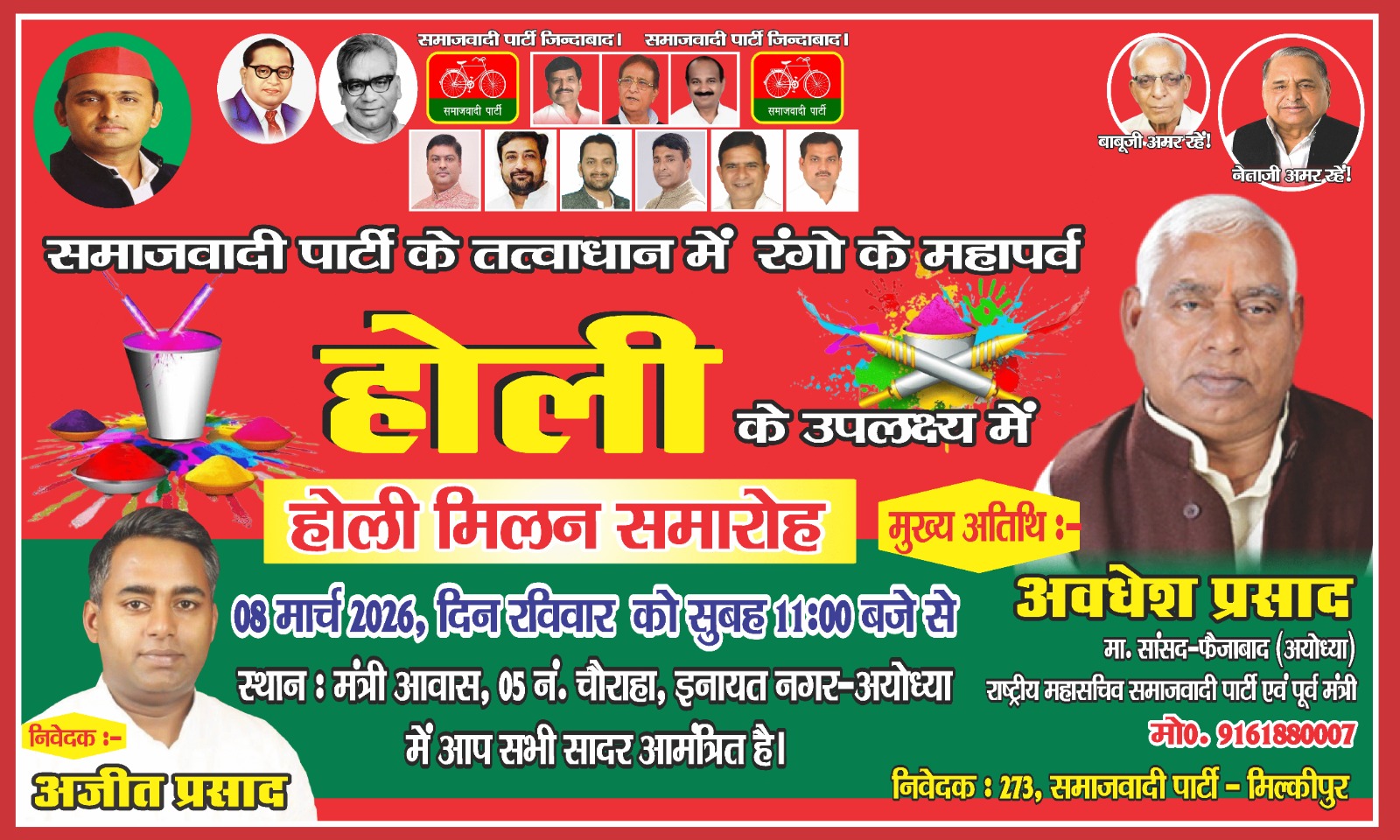 मिल्कीपुर अयोध्या होली मिलन समारोह में आप सभी मित्रों से अपील है कि भारी से भारी संख्या में समय पूर्वाहन 11:00 बजे पहुंचने का कष्ट करें आपका बहुत-बहुत धन्यवाद*