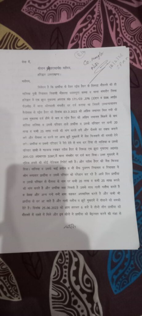 बुजुर्गों ने कहा कि वे मेहनत-मजदूरी कर परिवार चलाते हैं और इस उम्र में आए दिन मिल रही धमकियों से उनका घर से निकलना तक मुश्किल हो गया है। उन्होंने हरिद्वार पुलिस प्रशासन को शिकायती पत्र देकर पूरे मामले की निष्पक्ष जांच और संबंधित युवती के खिलाफ कड़ी कार्रवाई की मांग की है।